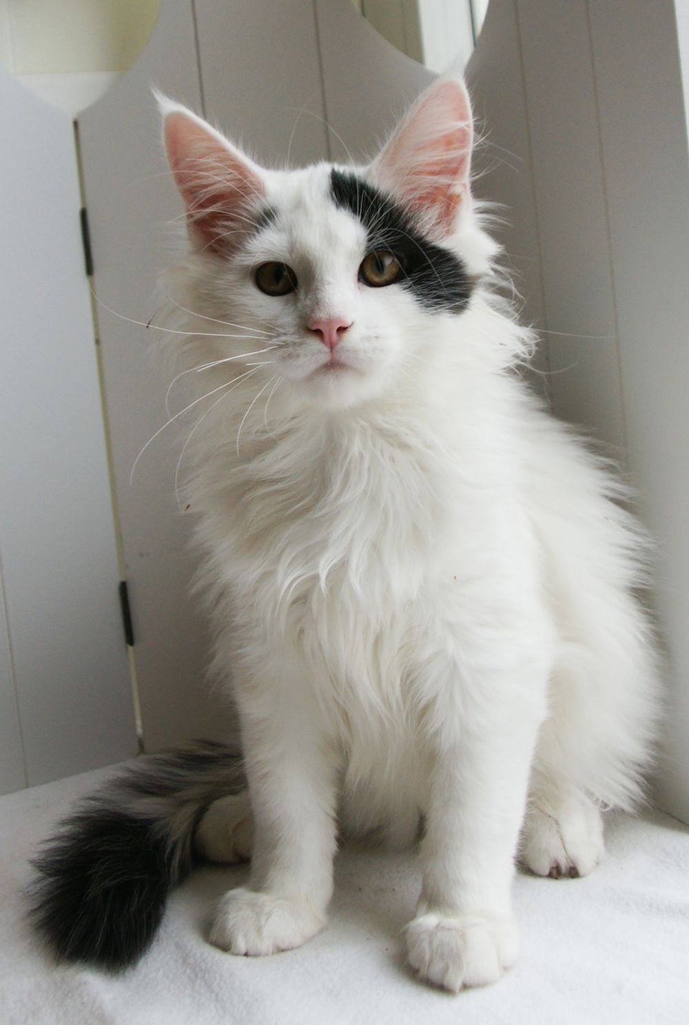 White is not a color. This is rather a lack of coloring of Maine Coons, because there is no color pigment in the hair. A small kitten may have colored markings on the muzzle, which disappear over time. Pets are unpretentious in care. White Maine Coons come with blue eyes and multicolored (one is blue, and the second is green). Absolutely green iris of the eyes, characteristic of silver color (description below). It is worth noting that such kittens have a risk of being born deaf! Therefore, it is better to choose a kitten from experienced breeders, as a rule, breeders conduct audio tests and get a conclusion about the presence or absence of hearing in a kitten. It is forbidden to cross two individuals of white color.